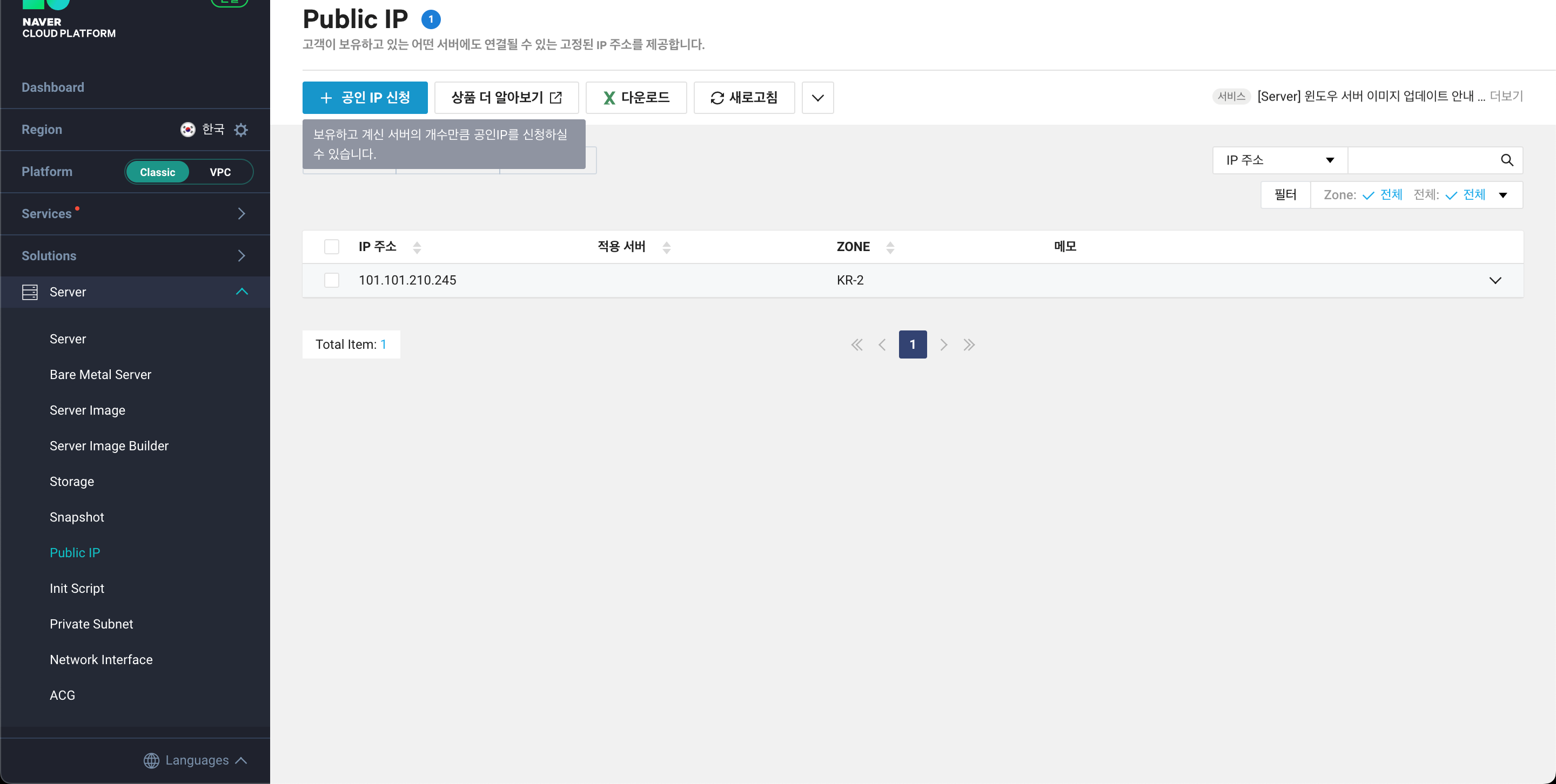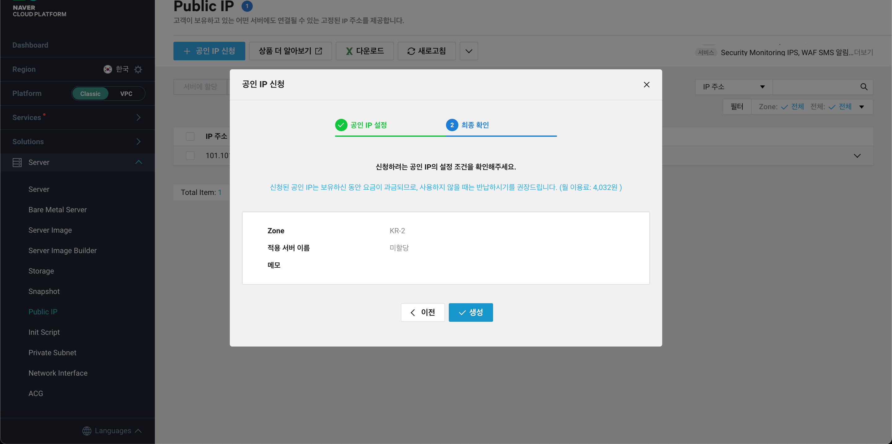 7. 공인 IP 생성 (웹 배포 후 해당 웹에 접속할 때 사용)