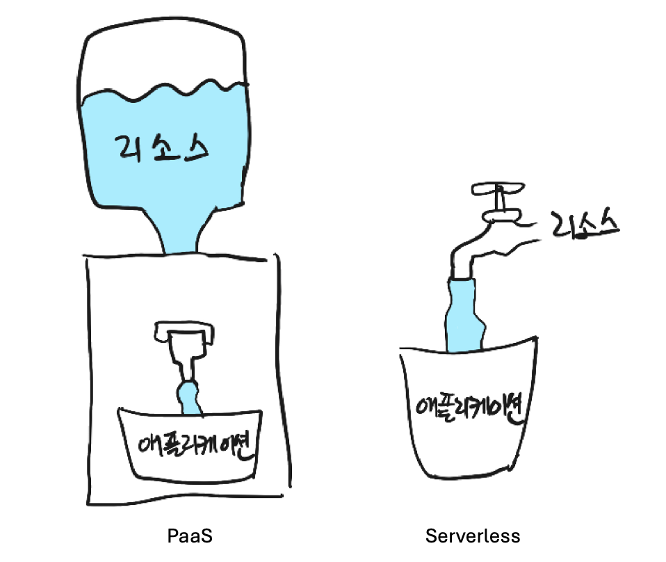 - PaaS는 필요에 따라 물통을 배달 받아 사용하는 정수기, Serverless의 경우 필요에 따라 바로바로 틀어서 사용하는 수도꼭지로 비유 가능