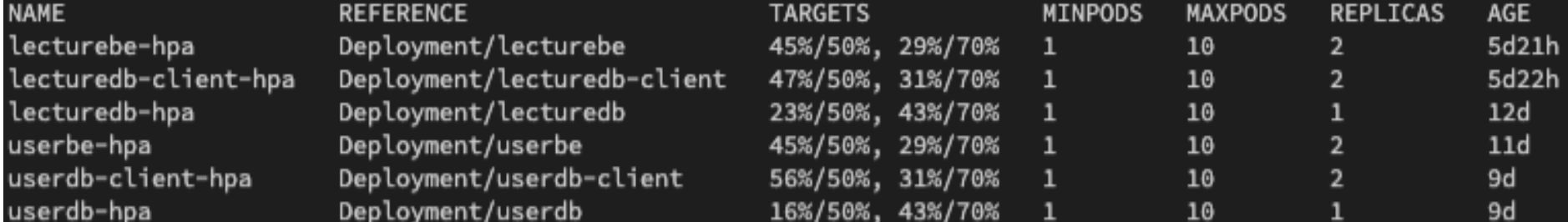 각 HPA가 잘 적용되어 CPU 사용량이 50%를 넘어간 서비스의 경우 오토스케일링이 일어나