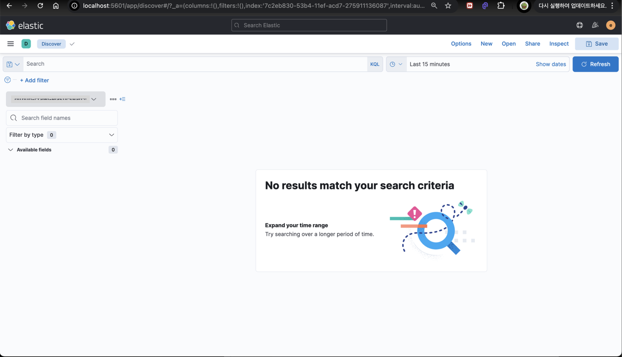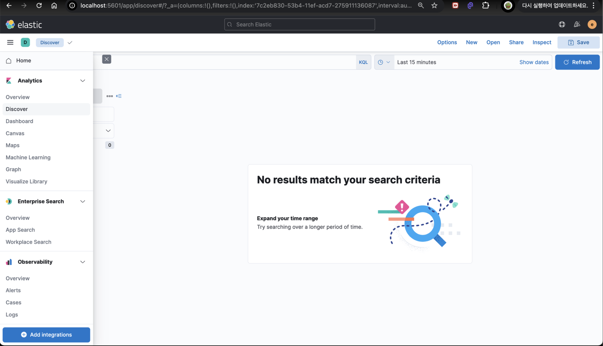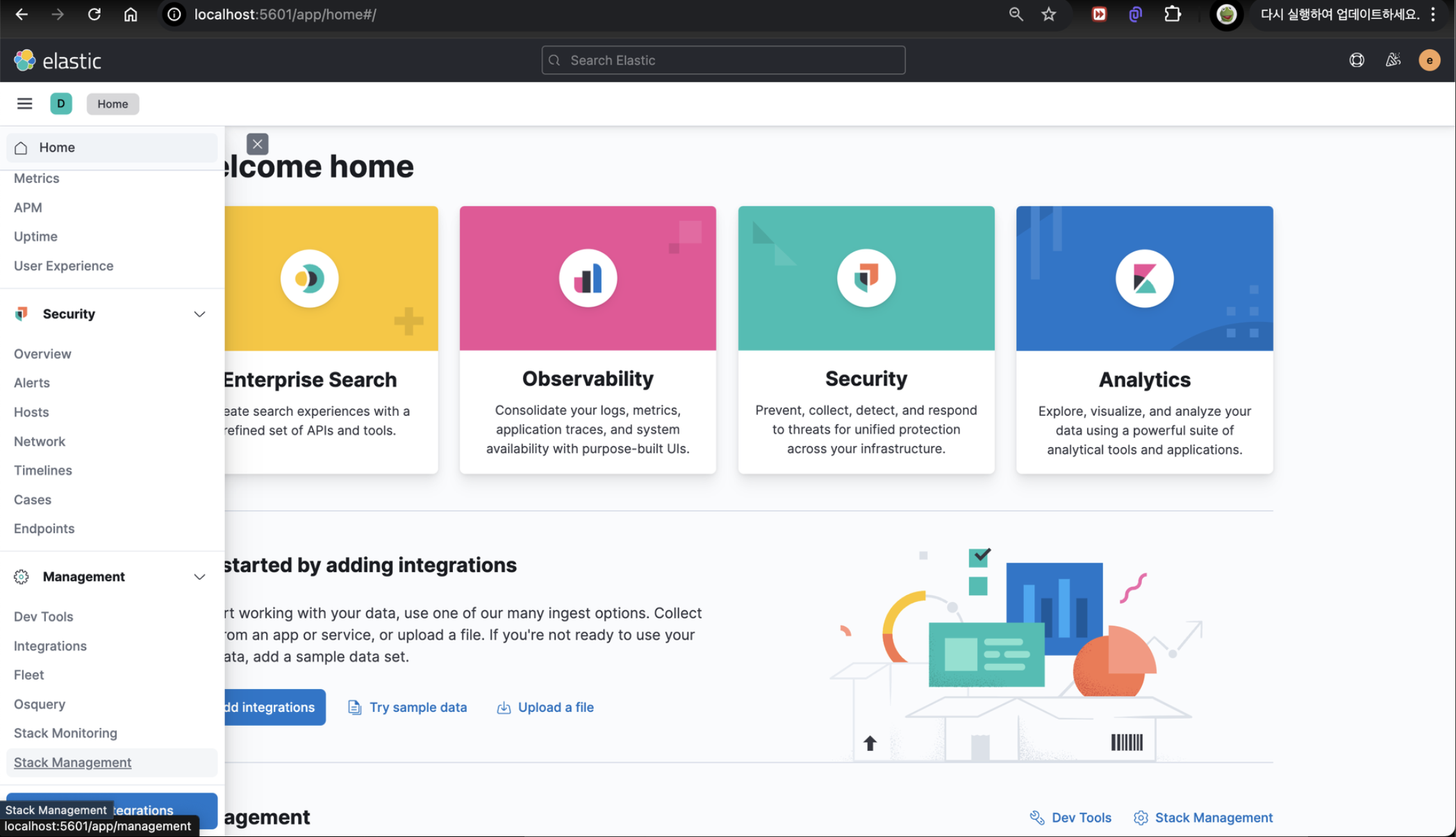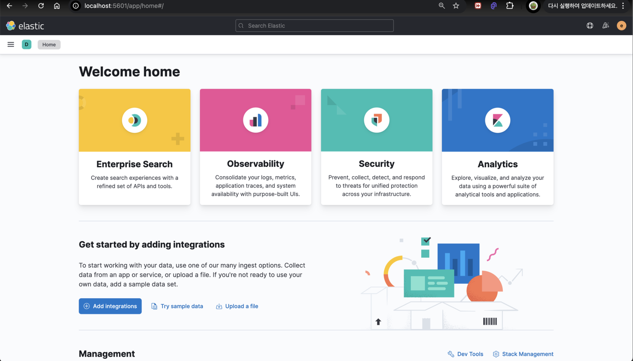 - 실행 후 웹 브라우저로 키바나를 접속하기 위해 localhost:5601로 접속