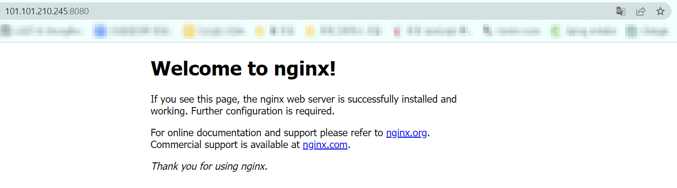 101.101.210.245[공인 아이피]:8080(개방 포트)로 접속하여 nginx 서비스 정상 시작 확인